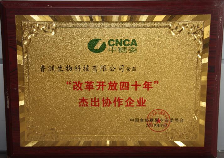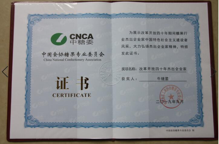 鲁洲生物科技有限公司荣获中国食协糖果专业委员会 “改革开放四十年”杰出协作企业,董事长牛继星荣获“改革开放四十年”杰出企业家。