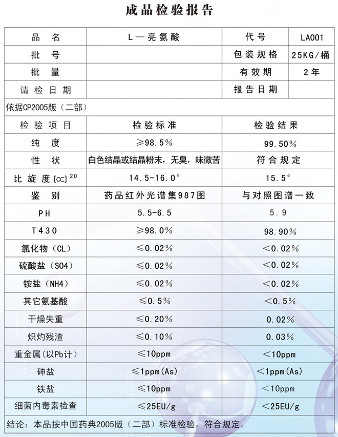 L-Leucine, (CH3)2-CH-CH2-CH(NH2)-COOH,L-2-氨基-4- 甲基戊酸,又名:白氨酸,分子式:C6H13NO2,分子量:131.17。